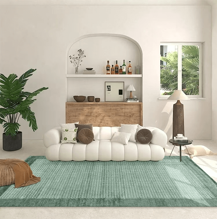 地面瓷砖越简单,地毯就要越“有戏”。森林绿+柔软亲肤的天丝材质组合,清新又治愈,配上耐脏好打理的短绒毛,让有娃和“铲屎官”家庭都能放心躺平。挑选地毯时,尺寸建议比沙发区宽10-20cm,更显大气不局促。