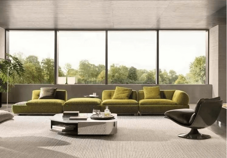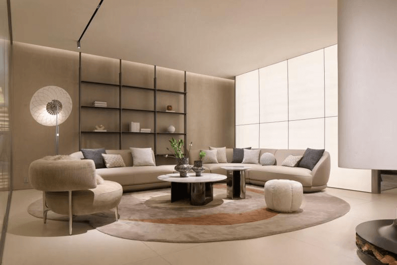 例如:在灰白基调的客厅中,一弯独特的上弦月造型沙发+几抹亮色,轻松塑造视觉焦点,让家既有格调,又不失轻盈的诗意。