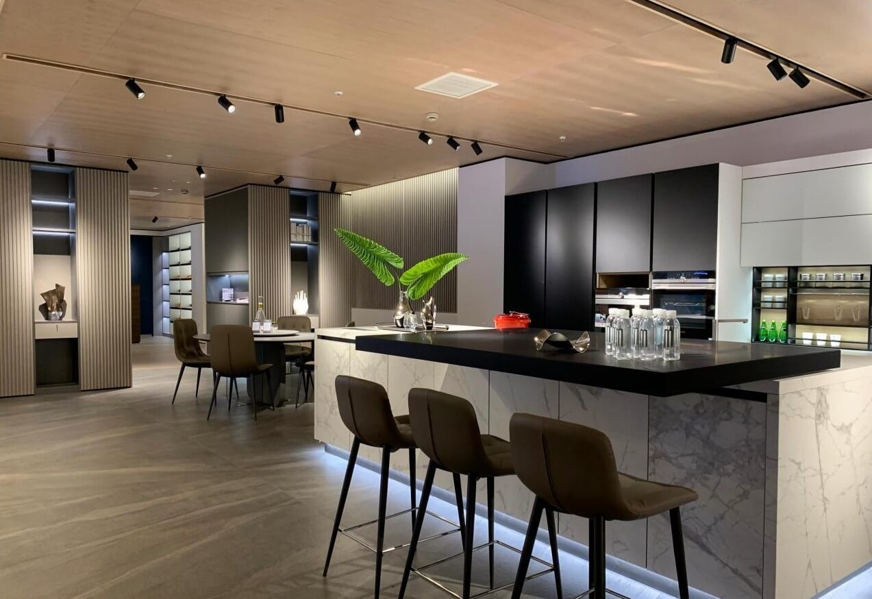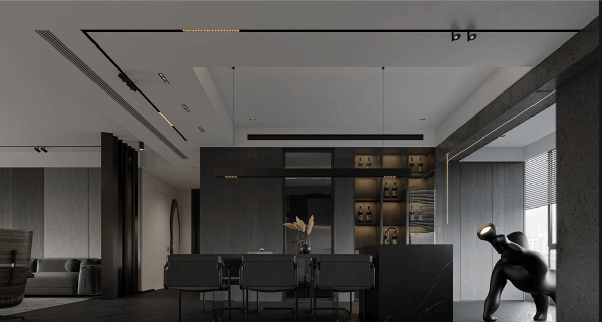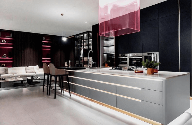 通常还会设计一个岛台作为延伸,搭配高脚凳,方便朋友围坐,形成一个全新社交场。此时,再施以一点光影魔法,增添一盏吊灯、几条隐藏式灯带,提供精准照明的同时,让整个区域笼罩在迷人光晕中。