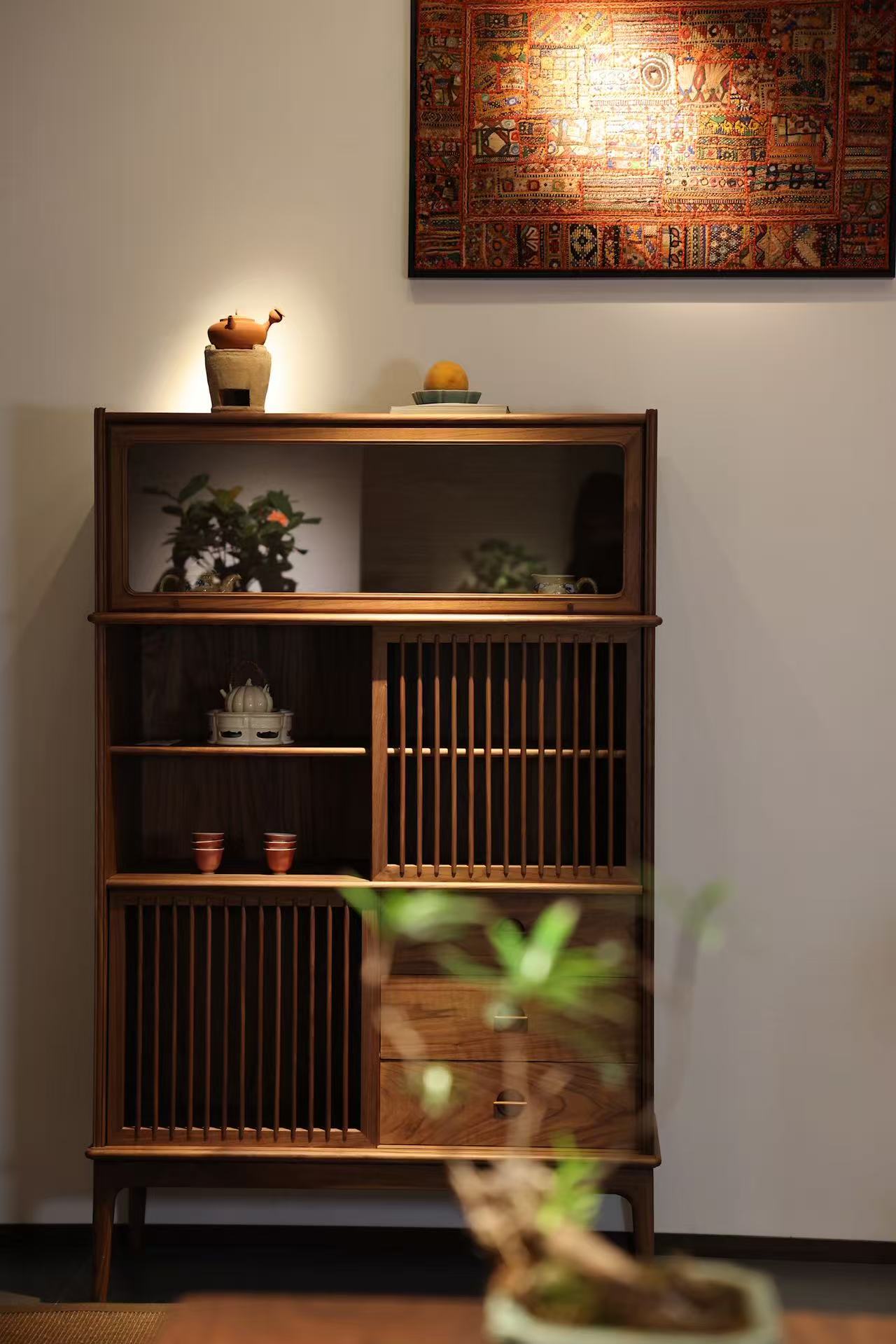 软饰陈设不在多,但求精,一套清润的茶器、一个古拙的陶罐,几枝随手插置的枯枝、新绿等,都是点缀空间的绝佳艺术品,瞬间将人引入风雅之境。