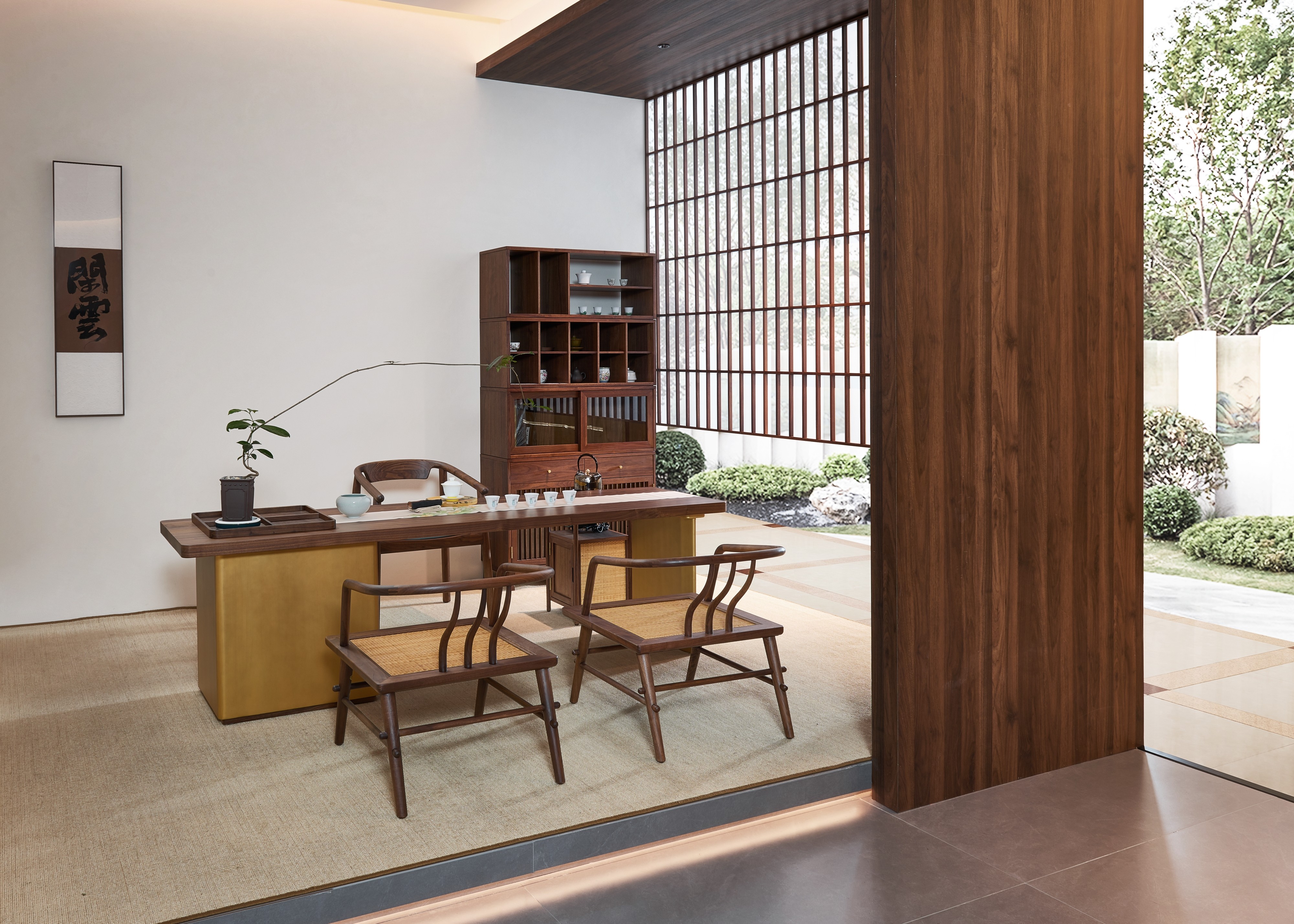 风格直接影响整个空间的气质和氛围,若想在家开辟一片品茶小天地,先要找到一个与自身审美和生活方式相契合的茶室风格。承载着东方千年底蕴的新中式风是最常见的选择,它巧妙融合了传统元素与现代设计,既有古典韵味,又契合当代审美。常以沉稳色彩、实木家具和水墨意境为主要特征,营造出一种内敛而高级的空间气质。