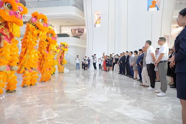 吉祥的锣鼓敲响热闹的舞狮环节,威猛的祥狮队在A座国际高定馆中庭一字排开,生龙活虎。六位集团领导为祥狮举行了隆重的“点睛”仪式。随后,精神抖擞的祥狮队进行生动有趣的采青表演,寓意生财利市。