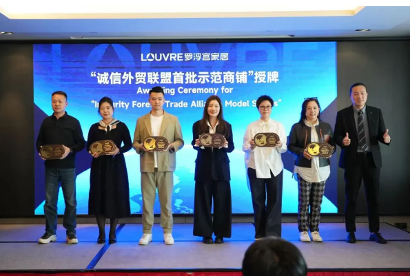 备受瞩目的“诚信外贸联盟首批示范商铺”授牌仪式同步举行,乐从家具城商会秘书长梁遂芝女士和罗浮宫家居集团品牌总监周佳荣先生为商铺进行授牌。此举旨在树立行业诚信标杆,激励全体商户见贤思齐,坚守诚信经营准则,以品质为核心持续精进。