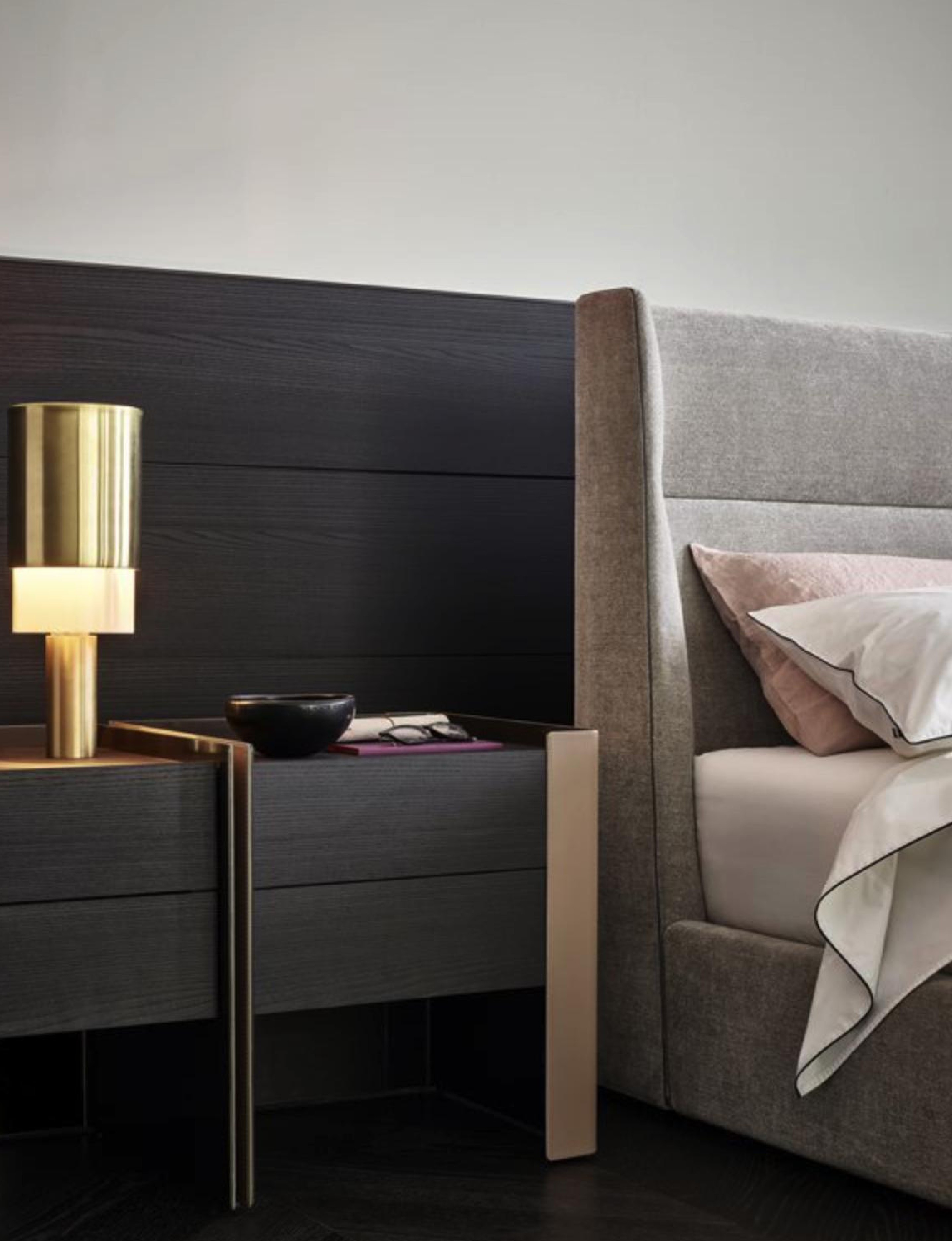 床头搭配一个简约高级的床头柜,双层抽屉容量更大,便于随手收纳充电线、眼镜盒等琐碎杂物。台面摆放一盏散发柔光的夜灯、一束精心打理的鲜花等,共同构建出优雅舒缓的入睡前奏。