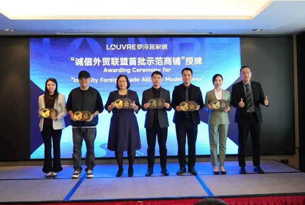 备受瞩目的“诚信外贸联盟首批示范商铺”授牌仪式同步举行,乐从家具城商会秘书长梁遂芝女士和罗浮宫家居集团品牌总监周佳荣先生为商铺进行授牌。此举旨在树立行业诚信标杆,激励全体商户见贤思齐,坚守诚信经营准则,以品质为核心持续精进。