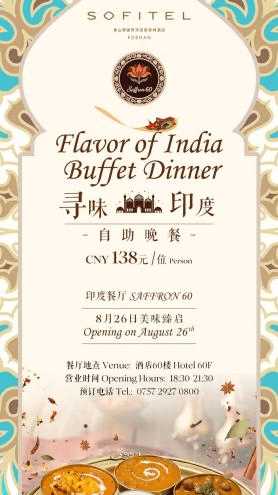 近期,罗浮宫索菲特酒店正上演一场香料魔法!在60楼高空,法式奢华情调与印度香料艺术巧妙融合,在云端为你呈现地道的异国风味盛宴。即日起-9月9日,推荐印度客户到店,享「限时折扣」。