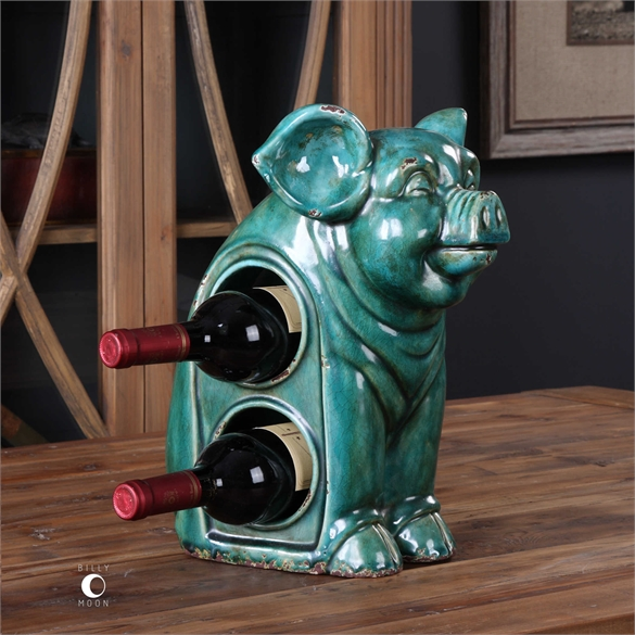 其实放酒器也可以很萌,像美国著名家饰品牌Uttermost这款玉绿色裂纹陶瓷猪,设计采用青铜色彩,同时用故意做旧的方式,打造出美式复古的风格,配上小猪一脸满足的憨厚表情,既高级又不失趣味性。当朋友来访时,在小猪肚子上的洞口放上两瓶你最喜欢的葡萄酒,让聚餐时光来得更浪漫、别致。