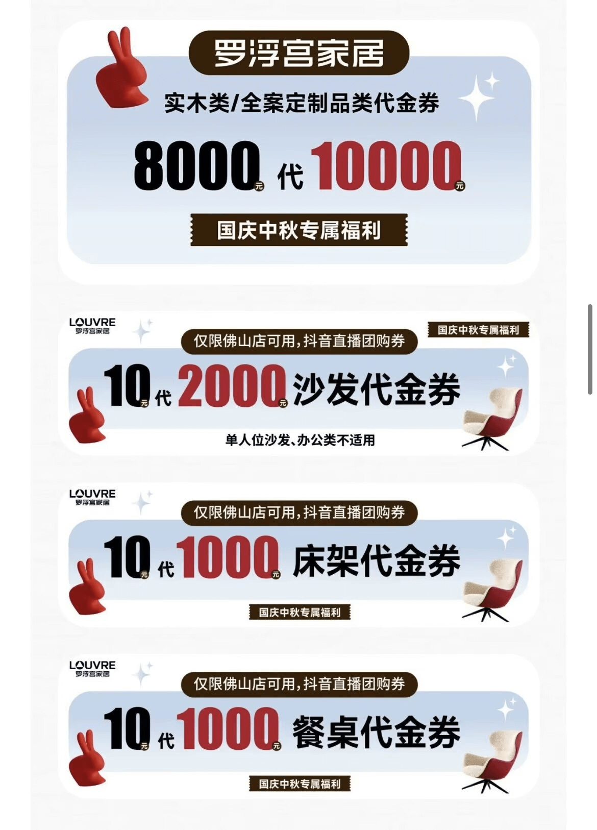 锁定「佛山罗浮宫家居」抖音直播间,提前囤好各品类超值代金券,软装饰品10元至高可代2000元,全案定制满万元专享2000元减免福利,让你的置家预算翻倍“膨胀”!