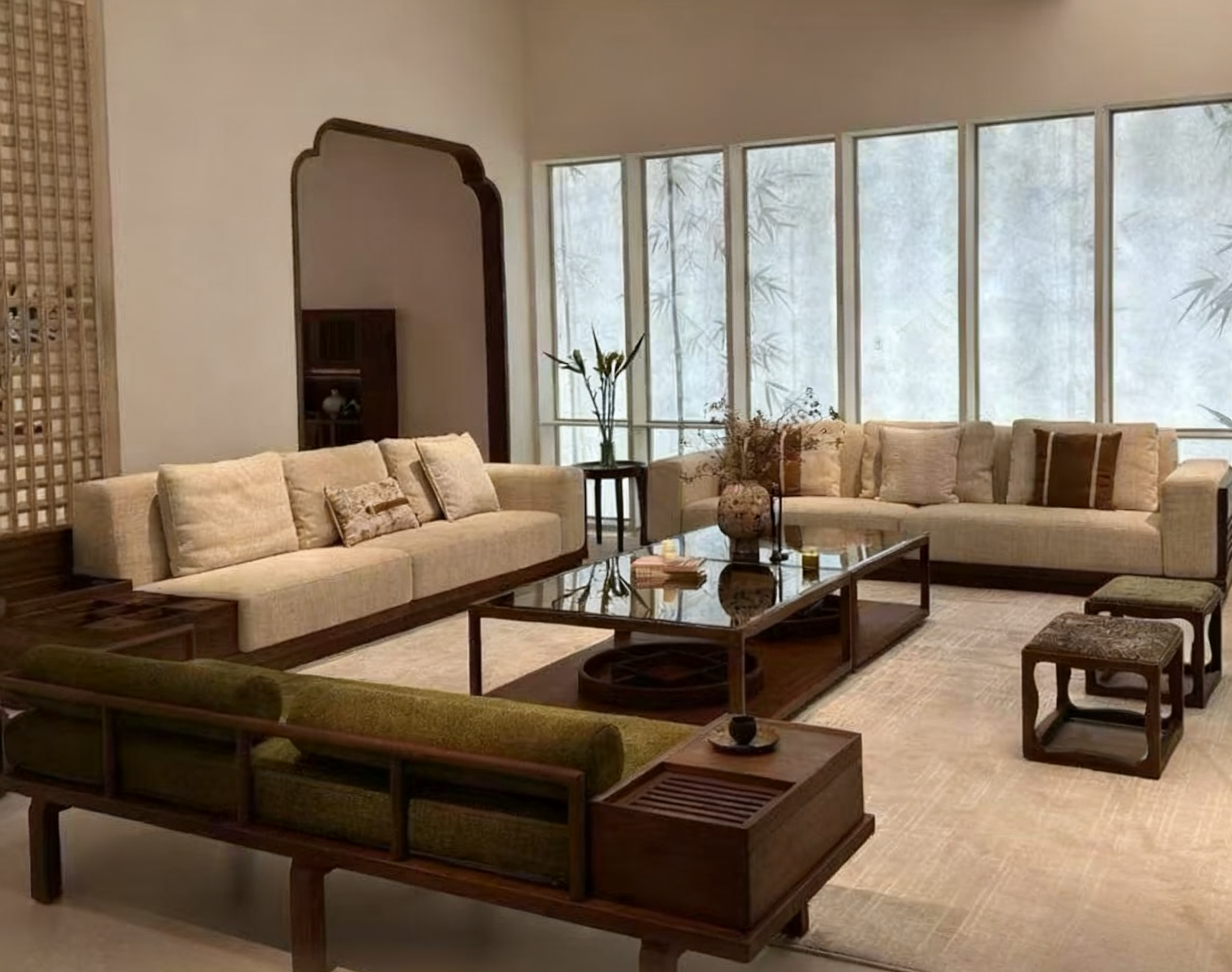 在这一基底之上融入豆绿,天青、靛蓝等微色彩进行点睛,巧妙打破大面积素色可能带来的单调,营造出舒缓而富有韵律的视觉体验。搭配时,避免过于鲜艳或强烈的对比,以维系空间的和谐与高级感。