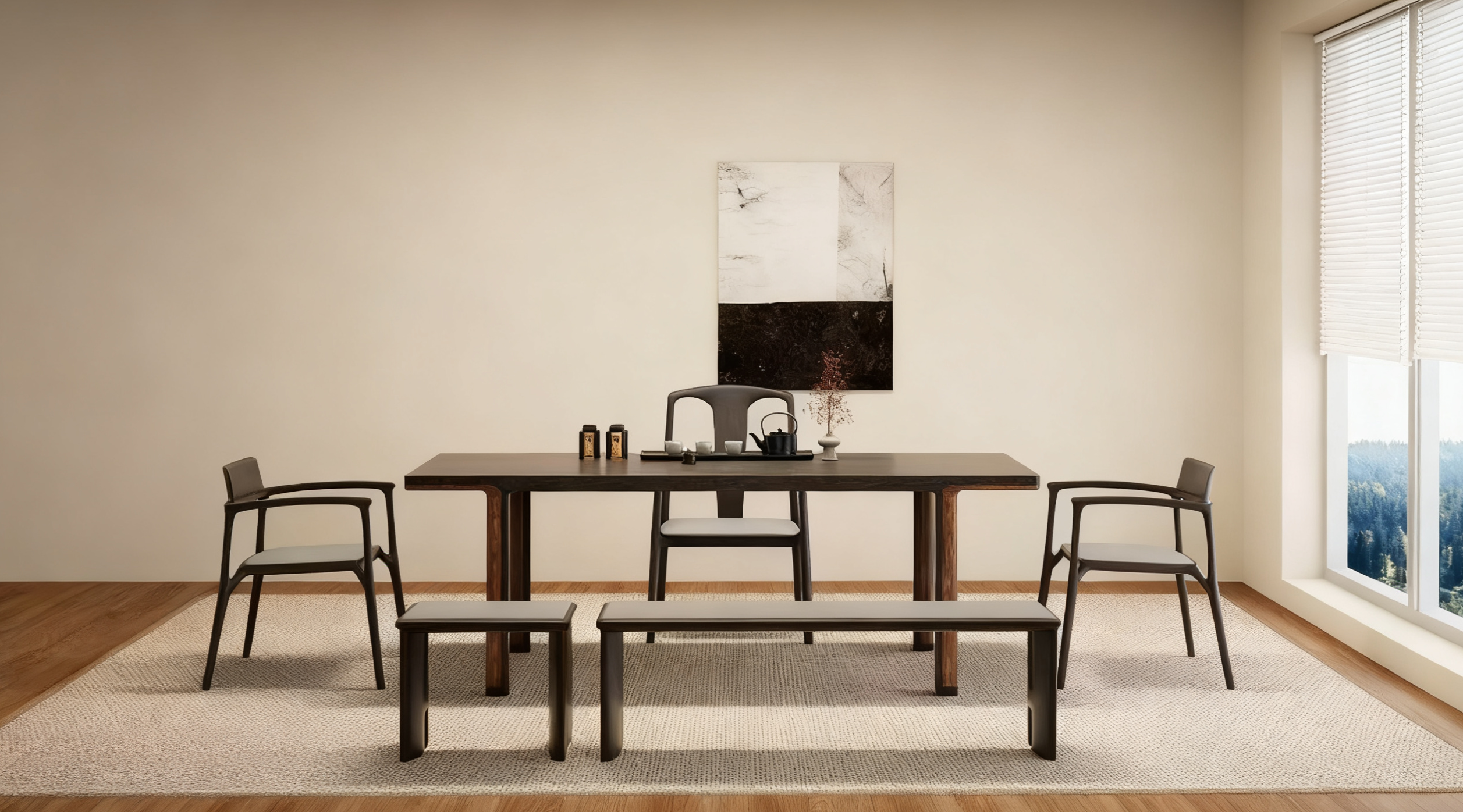 将“去繁就简”的原则贯彻到底,多选择线条纤细、造型轻巧的家具,保持空间与视觉的通透。此外,尺度低矮、贴近地面的家具,能更好地呼应宋人席地而坐的雅趣,促成一种更为放松的居家氛围。